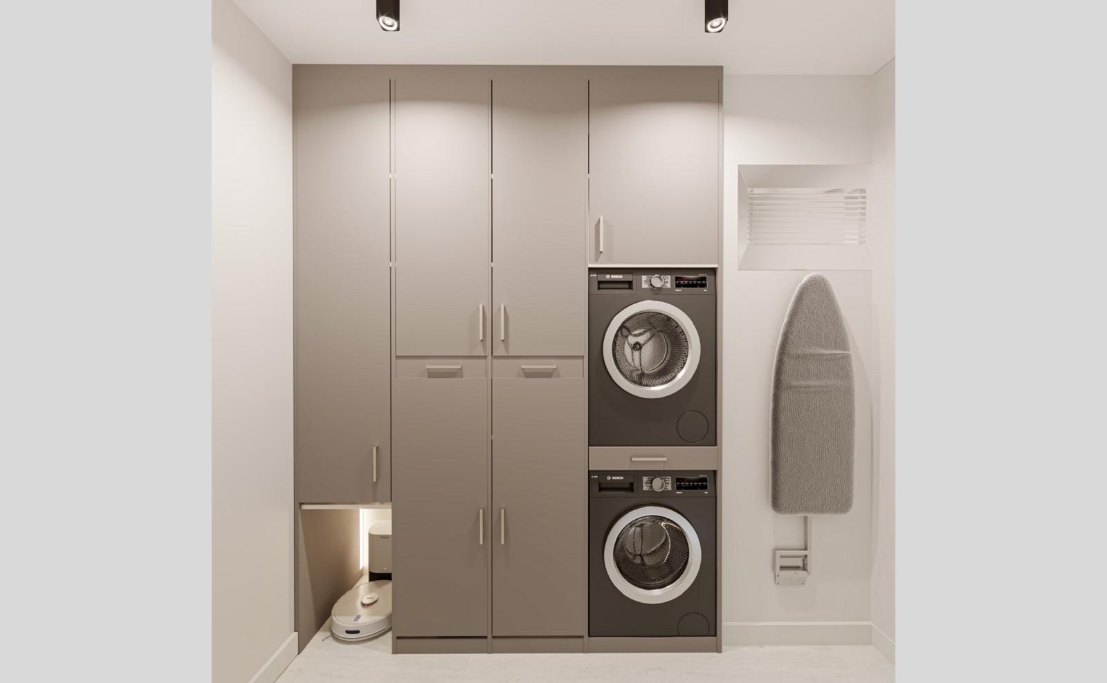 Fonksiyonel Alanlar: Portmanto ve çamaşır makinesi için özel dizayn edilmiş MDF lam dolap üniteleri.