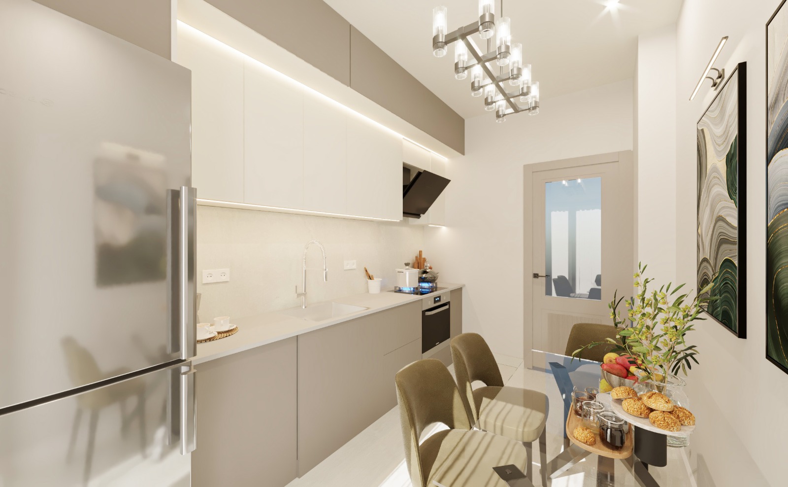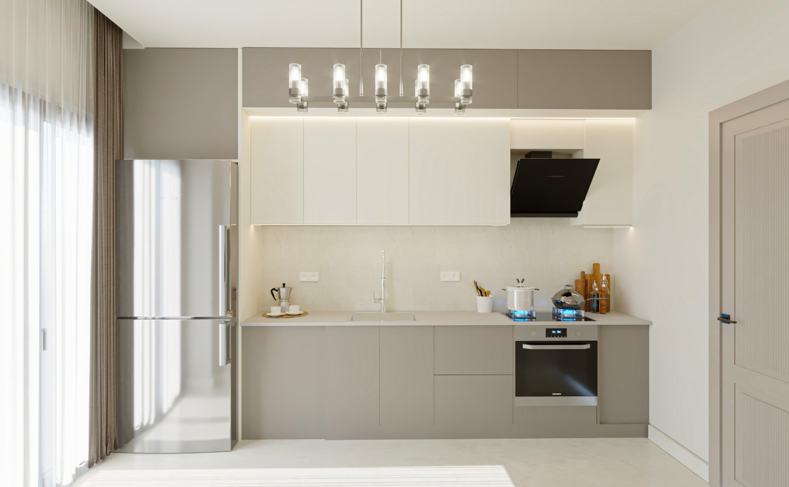 Mutfak & Banyo: Çimstone (Belenco/Coante) tezgahlar, akrilik mutfak dolapları ve 1. sınıf Kastamonu Entegre MDF lam gövdeler.
